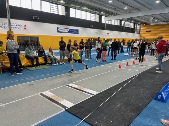 Die große Anzahl an Teilnehmern machte ein Aufteilen in zwei Gruppen notwendig. Bereits sehr früh am Sonntag morgen machten sich gleich 68 Athletinnen und Athleten samt Heimtrainern auf in die Molly-Schauffele-Halle in Stuttgart, um sich im 5er Sprunglauf aus dem Stand miteinander zu messen. Sehr gut präsentierte sich die Gewinnerin der W12 von der LG Teck. Melinda Denes-Hügel sicherte sich mit starken 10,91 Metern den Sieg mit knapp 20 Zentimeter Vorsprung vor Xenja Krivoklub vom TV Eppingen. Auch in der W13 konnte sich mit Valentina Wolf eine Athletin der LG Teckmit gesprungenen 11,78 Meter an die Spitze setzen. In der M12 sicherte sich Lukas Fritzsche (Spvgg Weil der Stadt) mit 10,92 Metern den ersten Platz vor Joshua Schrof (TSV Schmiden, 10,74 m) und Veli Mall (LG Teck, 10,48 m). Die zwei vordersten Plätze der M13 gingen an die Brüder Jonas und David Murschel von der LG Hohenfels. Jonas siegte mit 20 Zentimeter Vorsprung und 11,57 Meter Siegesweite.