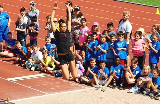 Neben zwei großen Verschnaufpausen zwischen den Stationen gab es auch in Stuttgart und Tübingen wieder jeweils zwei tolle Vorführungen der Topathleten, die den Kindern zeigten, wie erwachsene Athleten die Sportart, die sie im Moment noch ausprobieren, ausüben. So stellten Martin Jasper in Stuttgart, ebenso wie Gregor Traber am Vortag in Tübingen, ihr Können beim Heulerweitwurf unter Beweis. Auch disziplinfremd haben die Beiden dabei eine sehr gute Figur gemacht und das Wurfgerät quer über den Platz befördert. Der Applaus und das Jubeln der Kinder war vorprogrammiert. Auch Marie-Laurence Jungfleisch, eigentlich derzeit Deutschlands beste Hochspringerin, versuchte sich außerhalb ihrer Disziplin und verzauberte die Kinder in Stuttgart mit weiten Sprüngen in die Weitsprunggrube.